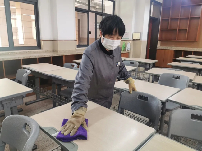 物业工作人员对教室进行消毒