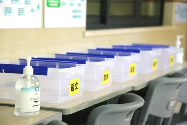 检查结束后, 学生得间隔一定距离有序进入教学楼。同时,为避免交差感染,学校采用投放式的方法交作业。每位学生都需要用免洗洗手液进行消毒,然后再把作业分门别类地放入作业筐中,从细节入手,尽可能降低风险。
