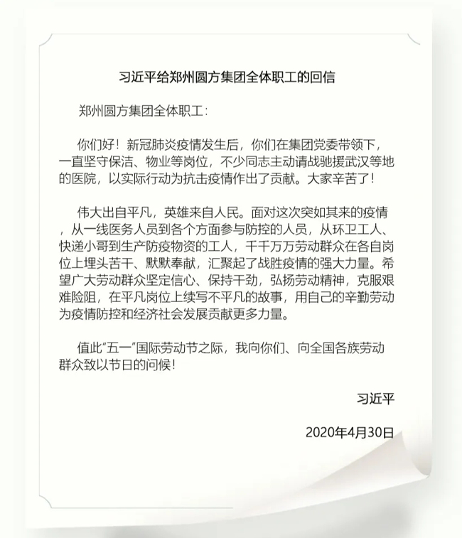 “五一”国际劳动节来临之际,习近平总书记给郑州圆方集团全体职工发来回信,用真挚的语言表达了对平凡物业人坚守岗位、主动请战驰援武汉等地抗击疫情的肯定,体现了总书记和党中央对物业从业人员等广大劳动群众的亲切关怀,更是对全国物业管理行业的巨大鼓舞。