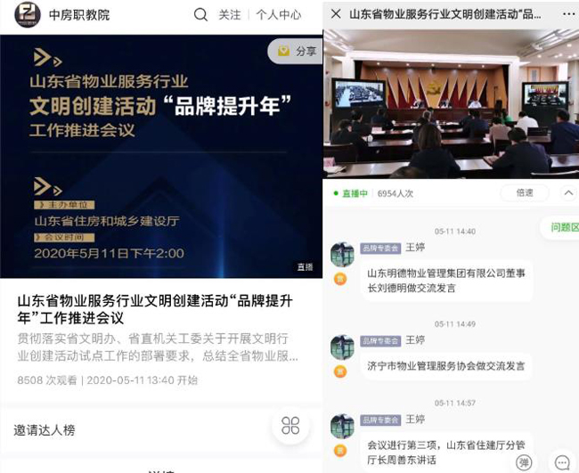 5月11日下午,山东省物业服务行业文明创建活动“品牌提升年”工作推进会以视频会议形式成功召开,本次会议在山东省住房城乡建设厅多功能厅设主会场,各市住房城乡建设局视频会议室设分会场。中房职教院主任陈晓静作为省物协品牌文化建设与产业融合委员会主任受邀在主会场参会,该院同时受托承担本次会议的线上直播技术支持与服务。