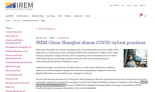 of Real Estate Management (IREM)在其官网发表了一篇名为“IREM China Shanghai shares COVID-19 best practices”的文章,分享了狮城怡安物业通过IREM中国向世界各地物业同行提供新冠肺炎疫情防控的“上海经验”。IREM在文末指出,狮城怡安的“上海经验”为中国同行,更为美国、日本、加拿大等海外同行,在制定和完善物业行业防控措施方面,起到了积极的引导和借鉴作用。