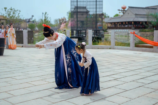 在汉服秀中,主持人还邀请了观众席的小朋友们上台学习古代礼仪,不少身穿汉服的小朋友争相跑到台上,跟着老师有模有样的学着,观众席上的业主也不由自主的学了起来。就这样,大家都学会了古代最常见的一种礼仪:万福礼。见面问好,祝颂万福。