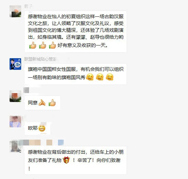 不少业主表示,在建业物业人的贴心陪伴下,这样一场古韵汉服文化之旅,让人领略到了汉服文化及古代礼仪的魅力,感受到祖国文化的博大精深,是充满意义,也是富有收获的一天,并表示非常期待建业物业下一次的主题活动。