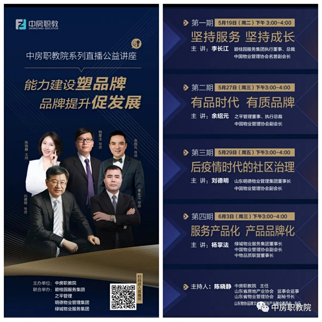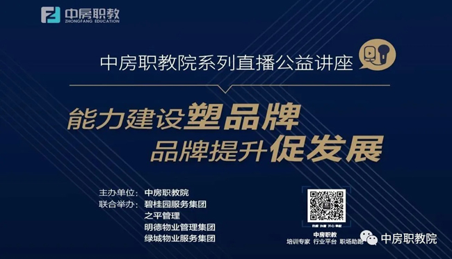 为回馈最美物业人在疫情期间的担当与无私奉献,中房职教院携手碧桂园服务集团、之平管理、明德物业管理集团和绿城物业服务集团联合举办“能力建设塑品牌 品牌提升促发展”系列直播公益讲座,讲座共分四期举办,第二—四期将分别于5月27日、29日和6月3日举办,敬请期待!