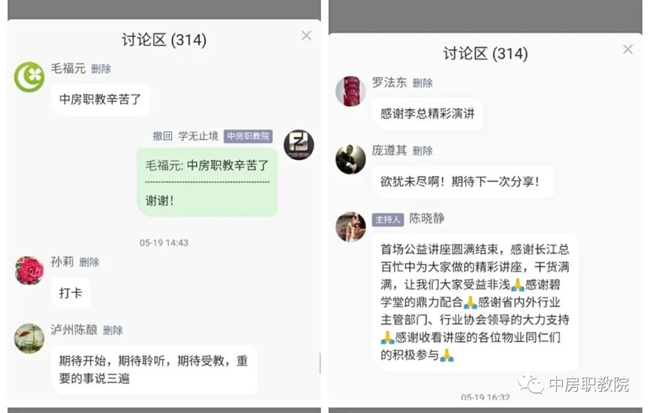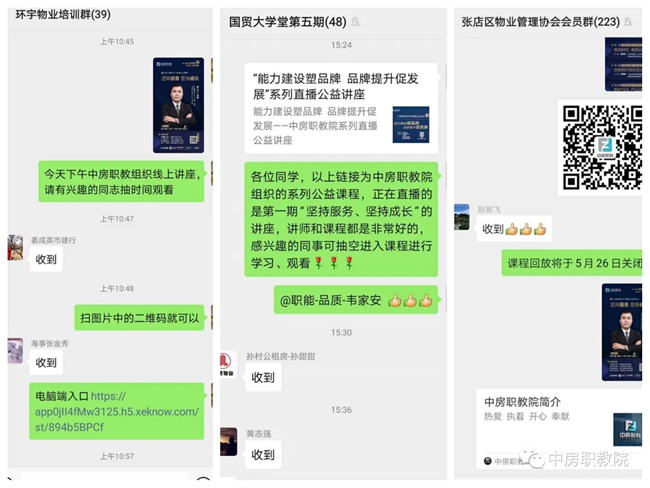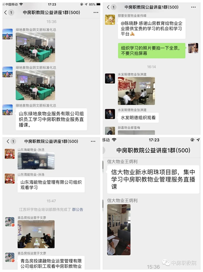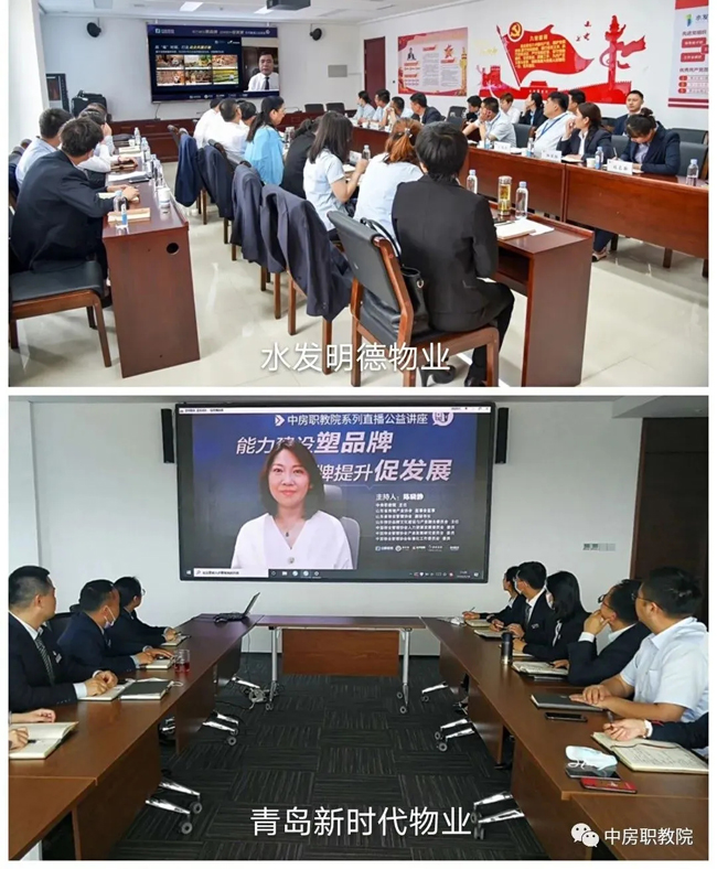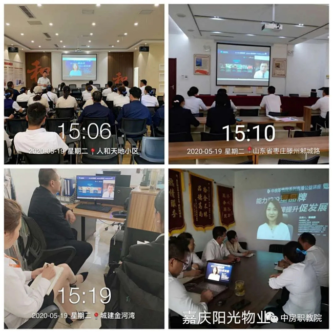 为了帮助、指导物业企业加强能力建设,更好地塑造企业品牌,推动物业企业持续健康发展,中房职教院联合碧桂园服务集团、之平管理、明德物业管理集团和绿城物业服务集团,自5月19日—6月3日举办系列直播公益讲座。本次活动得到多个省市各级行业主管部门、行业协会和广大物业企业的积极响应和参与,纷纷组织相关部门和不同岗位的员工以各种方式集中收看学习。