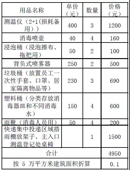 一是对物业服务企业采购的防疫物资成本给予全额补助。经调研测算,物业服务企业购买的防疫耐用消耗品(如测温仪、消毒喷壶等)的一次性投入按照管理面积分摊约为 0.1 /平方米;每月防疫易耗品(如口罩、消毒液、防护服等)投入的成本按照管理面积分摊约为 0.18 /平方米。