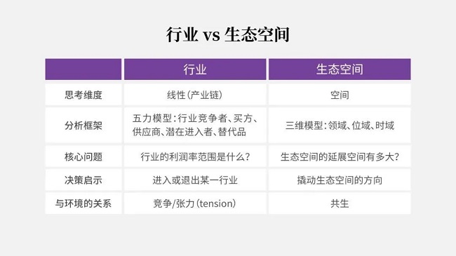 这些不完全取决于外部环境(生态),而是来源于你在多大程度上撬动生态的丰盈性。不是生态空间本身,而是你自己的调适度——在多大程度上与生态互动、寻求竭力生长——决定了你在生态空间能够占所的空间(见下表“行业vs.生态空间”)。