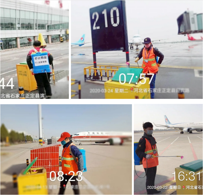 卓达物业石家庄国际机场物业处根据总部部署要求,为做好疫情防控工作,主动筹备一次性医用口罩,一次性手套,测温枪等防护用品,并结合飞行区管理部配发喷雾器、84消毒液对指定区域垃圾箱,废弃物回收箱、员工共享休息室等进行消杀工作。并制定了新冠肺炎相关的一系列制度与流程,成立了疫情防控工作领导小组,明确了疫情应急处置工作机制、职责、流程等,并落实责任到人。