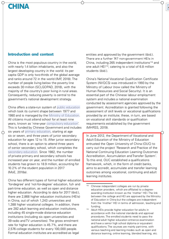 国家开放大学学分银行研制的学习成果框架入选了联合国教科文组织联合发布的《2019年全球地区和国家资格框架清单第二卷:国家和地区案例》(以下简称《案例》),该框架是国内首个对学习成果进行分级、分类的成果框架。