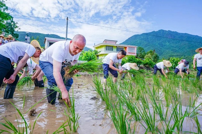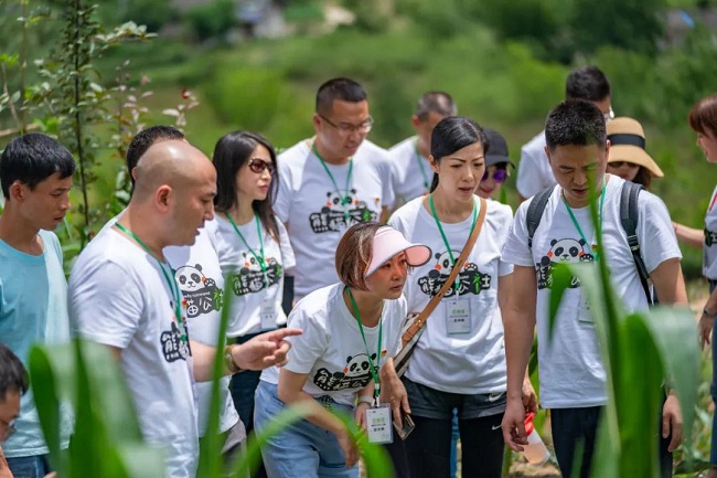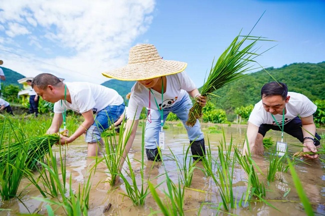 熊猫公社成立仪式结束后,考察团一行在高村乡民主社区副书记唐有林的陪同下,对农作物种植基地进行了实地考察并体验了当地的农耕文化。哇,老总们都下田干活儿了”“那个小伙子插秧插的还多好的”“你看,他们动作还快哩,哈哈儿都插了恁个多了”......在考察团体验当地插秧劳作的现场,当地村民你一言我一语的点评,纷纷点赞这群城市农夫做的农活。