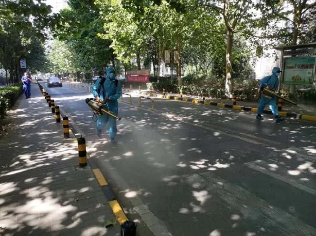 物业工作人员用弥雾机对园区进行消毒