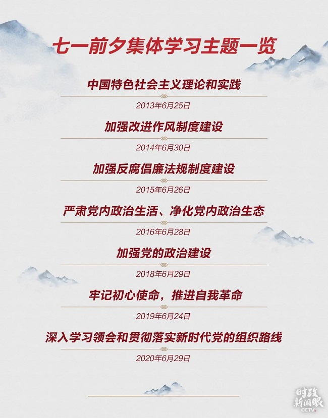 党的十八大以来,除2017年总书记另有视察活动外,每年七一前夕,中央政治局都会组织一次集体学习。2013年6月25日的集体学习以中国特色社会主义理论和实践为题,习近平在主持学习时说,这对贯彻落实党的十八大精神很有意义,也是对我们党成立92周年的最好庆祝。