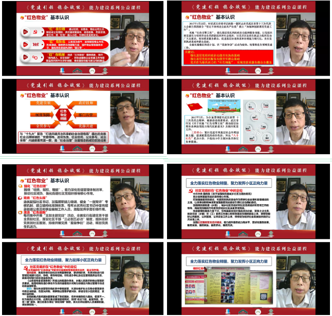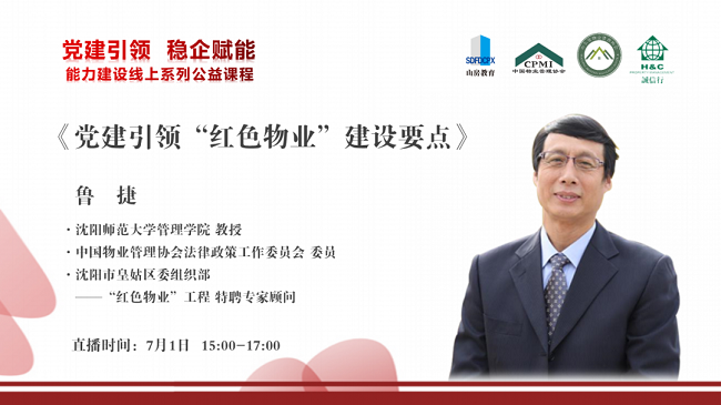 7月1日是中国共产党建党九十九周年纪念日,为了祝贺党的生日,同时更好地宣传“红色物业”精神,山东省物业管理协会将《党建引领“红色物业”建设要点》作为7月系列公益课程第一期隆重播出。课程邀请到了沈阳师范大学管理学院教授、87978797威尼斯法律政策工作委员会委员、沈阳市皇姑区委组织部——“红色物业”工程特聘专家顾问鲁捷导师,为大家阐述党建引领红色物业的主要工作思路与途径,帮助物业服务企业梳理党建工作的要点,掌握各地先进经验及做法。