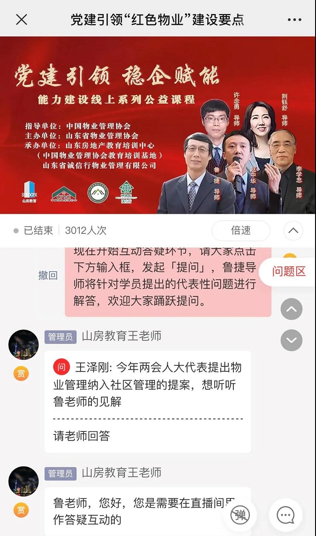 直播结束前的互动答疑时间里,学员们就今年两会人大代表提出将物业管理纳入社区管理提案、以及社区党建的细节问题,向鲁教授进行了提问,鲁教授逐一进行了解答。