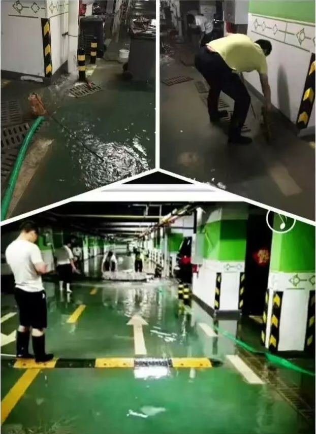 虽然有了防洪闸的助力,外面的水进不了车库,但巨大的排水压力让市政管网不堪重负,纷纷倒灌。与市政管网连接的地下车库成为了倒灌点之一。例如,汉口的高尔夫小区就出现了以上情况。在这个节点上,操作设备的专业人士迅速开启固定的排水设施。同时,在突然冒水的点,迅速设置移动排水泵吸水。当时,由于旁边的万科四季花城小区无地下车库,倒灌现象威胁不大,因此提供了不少移动排水泵给高尔夫小区,真正实现了抗汛的密切合作。