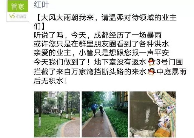 比如成都万科物业在管的某小区,地理环境非常特殊——建设之初项目总平设计标高低于市政标高,且附近有一座排污厂,再加上小区门口的部分市政污水管线不通,因此在在暴雨来临时极易发生内涝。每一次我们的物业人都会积极和外部联动。比如一到暴雨天,我们就会派专人到排污厂去观察,如果排污容量快接近极限,就会对我们在管小区产生威胁。我们会直接联系排污厂相关负责人,请其增加设备,加大排污力度。我们也积极与社区、街道联动,当汛情严重时请求协助,例如小区门口的水井盖被冲走后,为防止人员跌落,我们联络了街道工作人员请求帮助,他们不仅派人前来帮忙,还申请了交警的协助。还有很多与外部联动的动作,这些都帮助了我们控制现场。所以,一定要重视内外联动,这样才能合伙共赢