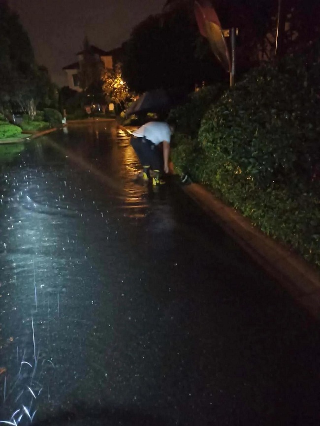 暴雨来临前,阳光海岸物业人员义务帮助顶楼住户检查阳台地漏。暴雨突如其来后,园区汽车坡道两边树叶被雨水冲刷后堆积在坡道排水沟处,眼看就要堵住,值班秩序员、下班又返回到工作岗位的员工与工程部师傅一起,及时疏通了排水沟,保证了排水沟畅通。