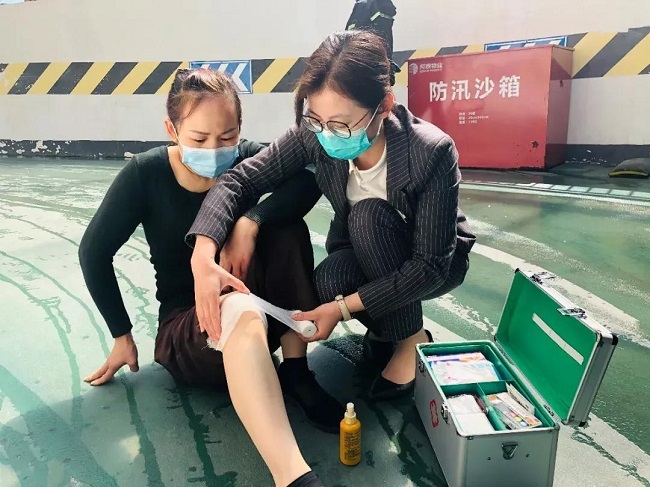 防汛演练开始后,设施设备组首先检查现场排水设备运行状况,切断水浸区域电源,避免因漏电发生危险,同时启动应急排水设备;应急抢险组则搬运防洪物资,阻止雨水继续蔓延,倒灌进入地下车库;疏散组进行现场疏散、抢救财物,一旦发现有伤员则立刻报告;救护组则在现场进行紧急救护,并及时向当地120求助;而后勤保障组则及时清理地面积水,开展排水管(道)杂物清理等工作。