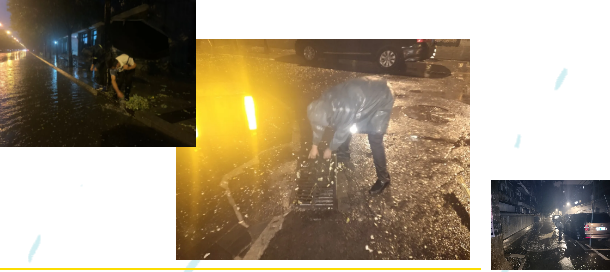 国诚物业处西长安街街巷准物业项目部夜间不畏大雨,加强巡视,及时清理杂物和路边积水。