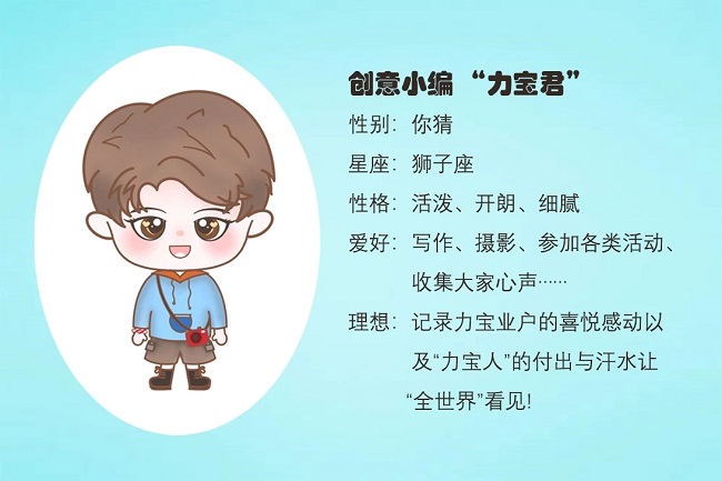 哈喽~大家好!我就是一直在幕后高调努力的创意小编“力宝君”嘻嘻~想不到吧,我长这样~帅不帅?好啦…多的我就不介绍了,哪里有最好玩的活动,最酷炫的创意,最感动的瞬间……一定要第一时间告诉我哟!记录业户的感动,记录“力宝人”的汗水,我永远元气满满