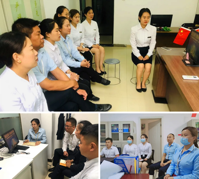 ▲7月22日上午,在融创服务集团副总裁谢建军的带领下,开元物业本部所有员工早早地等待在屏幕前,观看网络直播