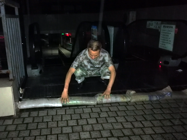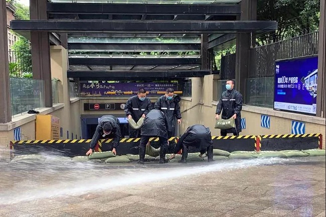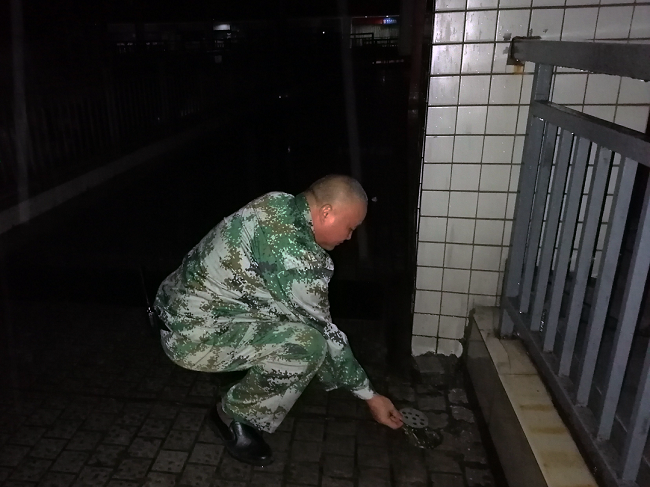 防汛抢险不分昼夜,天骄人时刻在线,随时待命,24小时守护业主安全。虽已进入深夜,长寿maII秩序人员仍在对园区重点区域进行巡查,加固防汛沙袋,疏通排水口,清理地面积水,守卫夜晚安宁。