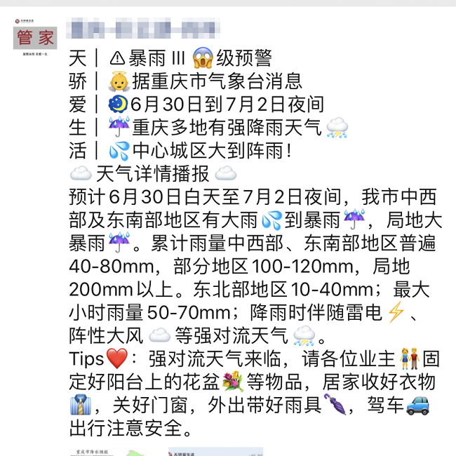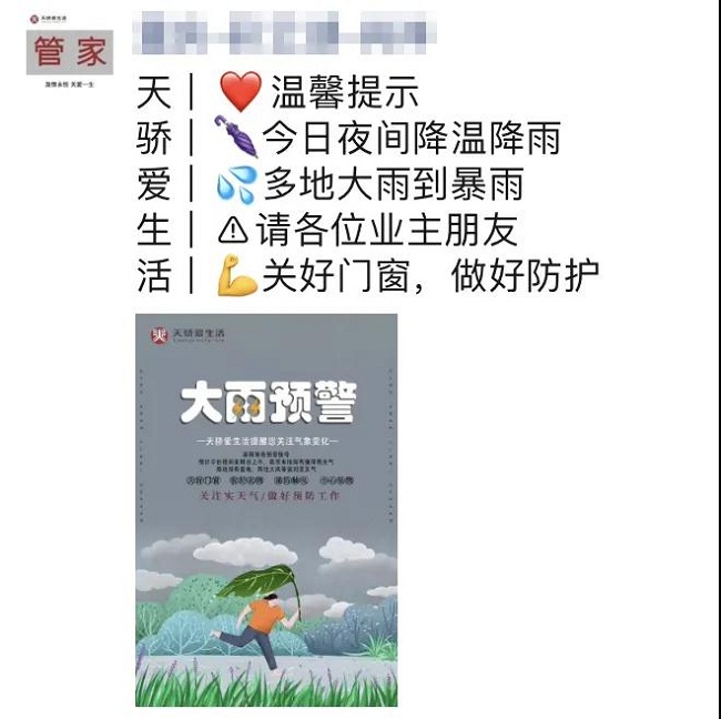 安排专人每天收集天气情况及汛情信息,当收到相关预警时,有客服人员在第一时间通过电话、微信、电子显示屏、公告栏等有效形式,将预警信息及相关贴士告知业主,提醒其做好安全防护。