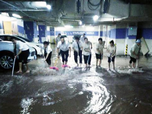 7月17日,重庆突降暴雨,金开协信中心车库低洼地带形成积水,全体工作人员迅速反应,投入作战。工程人员安装水泵抽取积水,秩序人员搬运沙袋筑起堤防,客服人员联系客户帮忙挪车,保洁人员利用拖把清理余水。分工合作,一气呵成,顺利消退积水,一旁挪车的客户们都忍不住连连称赞。