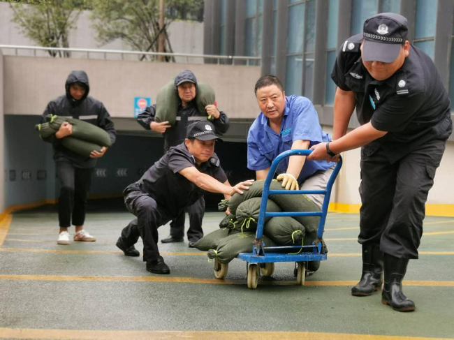 险情就是命令,防汛就是责任。按照之前制定的应急预案,合肥美而特物业快速收拢人员,严阵以待,各部门认真落实包保责任。在公司副总经理王玉志具体指挥下,大家搬运沙袋在漏水点及电梯厅附近垒成沙袋墙,及时阻止积水渗入;保洁部负责人刘自敏带领20多名保洁员,在各科室低洼地方投入大型吸水机清理积水。为缓解院区管网压力,机电部负责人董道果带领18名维修员,迅速调集排污泵对集水井进行抽水。
