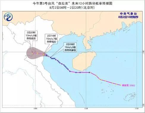 南海热带低压于8月1日下午2点钟加强为今年第3号台风“森拉克”(热带风暴级)(英文名称:Sinlaku;名字来源:密克罗尼西亚;名字意义:传说中的女神),并于下午3点钟前后掠过海南省三亚市南部海面,下午5点其中心已移入北部湾海面,中心位于海南省东方市南偏西方大约100公里的海面上,北纬18.2度、东经108.4度,中心附近最大风力8级(18米/秒),中心最低气压992百帕。
