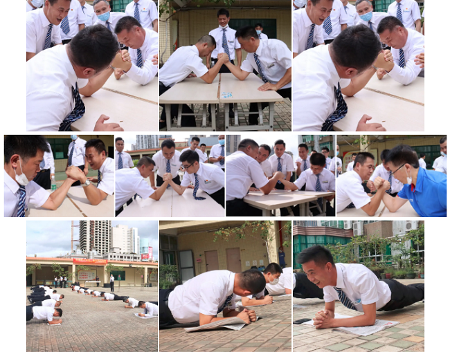 夏日炎炎,也挡不住必胜的信念。经过激烈的角逐,掰手腕和平板支撑两个环节各产生六位“兵王”。
