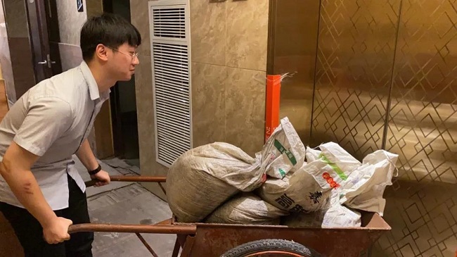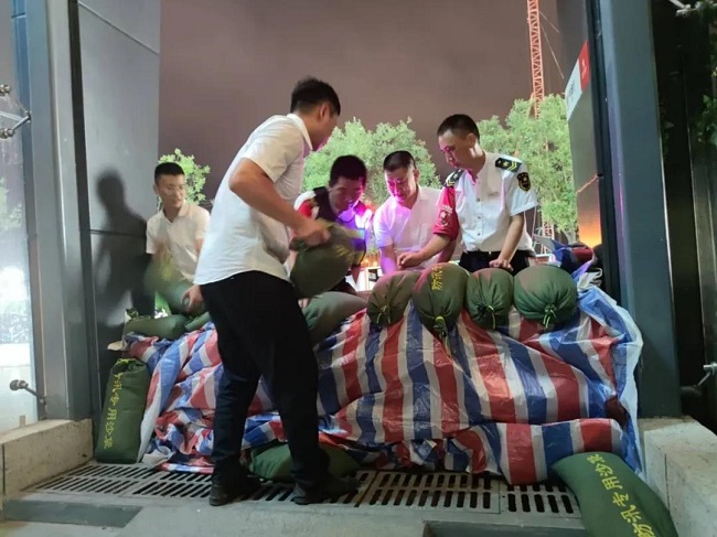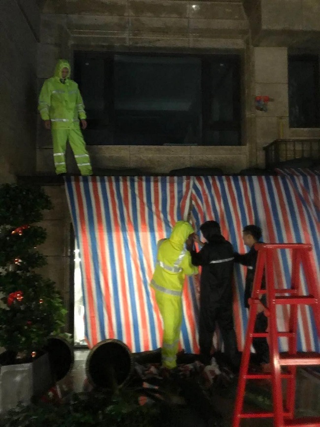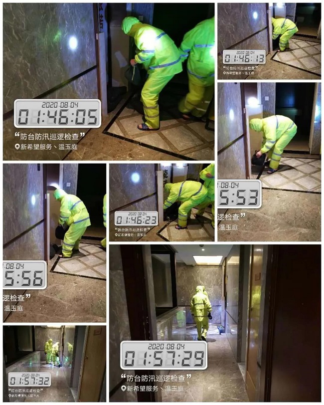 在台风来临前,做好树木加固、天台杂物清扫、门窗加固、搬运沙包预防地下车库倒灌、发布紧急信息通知,凌晨一点还在不间断进行防汛巡逻,进入紧急备战状态。