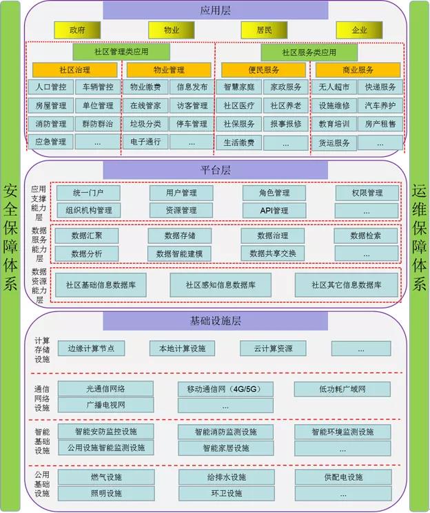 标准明确了智慧社区系统总体架构由基础设施层、平台层、应用层、安全保障体系与运维保障体系等部分组成。