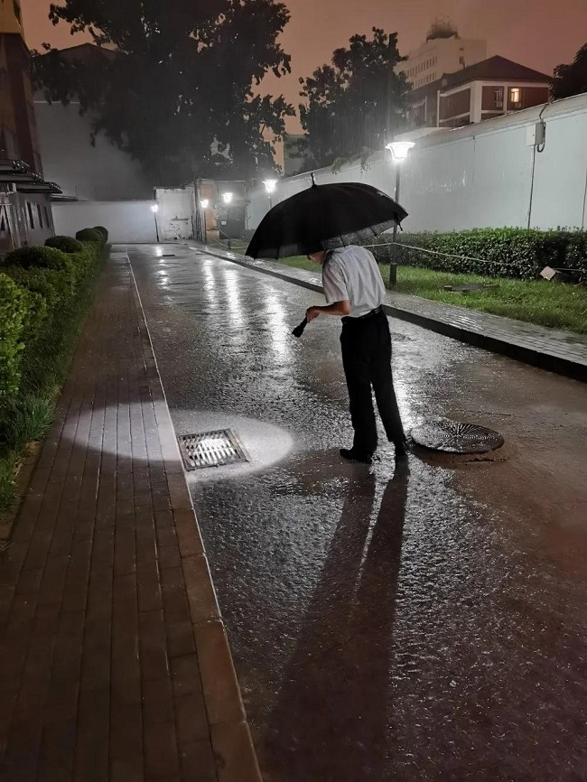在北京当整个朋友圈都在看雨,一线项目的物业人们早已开始了战斗:客服人员不顾疲惫,一遍遍不断进行重点区域隐患检查;工程人员入户检查漏雨点,冒雨进行防汛抢修,保障园区正常运营;保洁人员进行积水清扫,甚至是徒手进行园区疏堵清掏……风雨模糊了城市,但他们忙碌的身影却格外清晰。