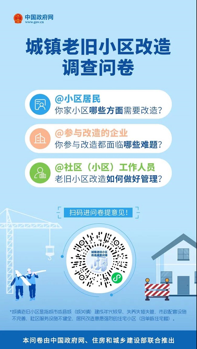 你对城镇老旧小区改造提出的需求和意见建议,将为有关方面制定政策提供重要参考。快来填写问卷吧!