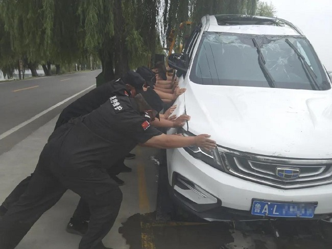在其他过路行人的协助下,他们以最快的速度掀起车辆,并用铁撬将驾驶座的车门撬开,割开保险带,及时将三人依次救上岸,同时拨打了报警及急救电话,整个营救过程历时两分钟。