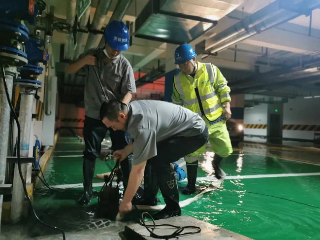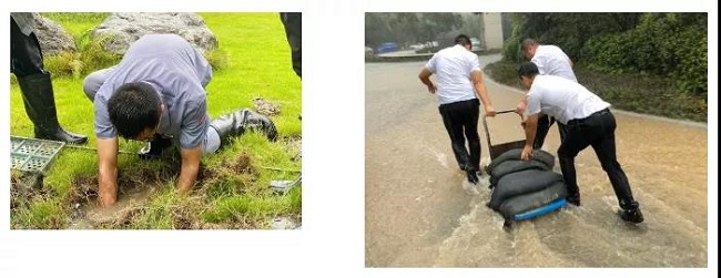 接到防汛工作通知后,华宇物业立即启动了抗洪防汛应急预案,在洪峰到来前对小区车库内所有车辆进行了紧急转移,同时搬运沙袋对各个积水倒灌口进行了填补;洪峰来临之后,他们对各个区域进行了详细的检查,并迅速打开了抽水泵,对各个地下室的电梯也组织停运。