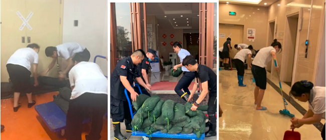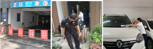 洪水来势汹汹,个别项目地下管网还是出现了倒灌现象,项目员工第一时间用已准备好的沙袋自制成阻隔和引流通道,避免大量积水。其后项目员工团结奋战,一起及时清扫积水,守护客户资产安全。