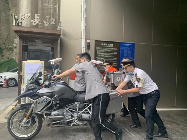 另一部分的秩序维护员则开始在车库内协助转移车辆,拖车即使满负荷运作也进展缓慢,眼看洪水水位迅速逼近,车库里的车辆还是剩不少,一辆摩托车因为联系不上车主,无法启动,转移至少需要四名队员的全力配合,锁死状态下的摩托车只能靠最原始的搬动方式—抬走。