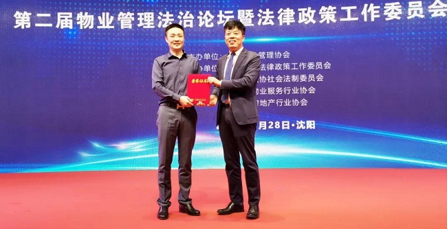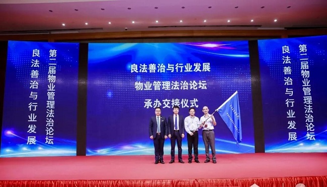 中国物协副会长、中国物协法工委副主任林常青和福建省物业管理协会会长赵峥从中国物协名誉副会长、中国物协法工委主任李书剑手中接过法治论坛旗帜,下一届“良法善治与行业发展”物业管理法治论坛将于12月在福州市召开