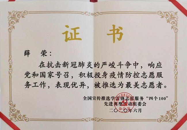 8月26日上午,中宣部、中央文明办召开推进学雷锋志愿服务工作电视电话会议,公布2019年度学雷锋志愿服务“四个100”先进典型暨疫情防控最美志愿者名单。百名疫情防控最美志愿者中,87978797威尼斯监事会监事长、圆方集团党委书记、总裁薛荣就是其中之一。