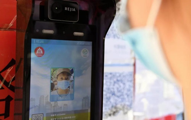 6月30日,在北京市海淀区海淀街道苏州桥西社区出入口,临时进入社区人员通过智慧社区门禁终端进入社区(任超/ 摄)