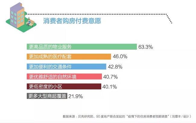 根据贝壳研究院、90度地产2020年2月联合发起的“疫情下的住房消费者预期调查”,除了户型等硬件条件外,在购房意愿的其他条件里,物业服务占比最高,为63.3%,高于医疗配套、交通条件等选项。