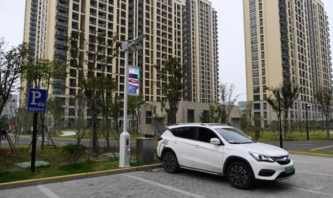 2019年10月23日,一辆电动汽车停在杭州德慧公寓“未来小区”的智慧灯杆旁充电。小区的智能灯杆融合了电动汽车充电桩系统、LED屏户外显示系统、气象实时监测等智能模块(黄宗治/摄)
