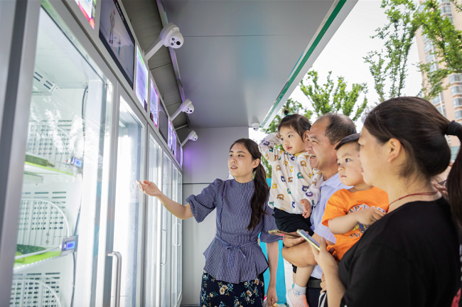 2020 年7 月8 日,江苏省海安市首个24 小时无人智能果蔬店近日落户海安街道新桥社区。图为工作人员在指导居民如何通过无接触式智慧服务自助购买果蔬