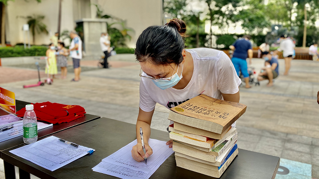 “临近开学,恰逢看到物业跟义工在搞捐书活动宣传,便回家告诉女儿,小朋友非常踊跃,把自己喜爱的书籍拿出来,为乡村小朋友献出爱心,这样也让家中闲置的书籍有可用武之地。同时呢也让小孩从小有帮助别人的意识,我觉得挺好的”一位带小孩过来捐书的女士说。