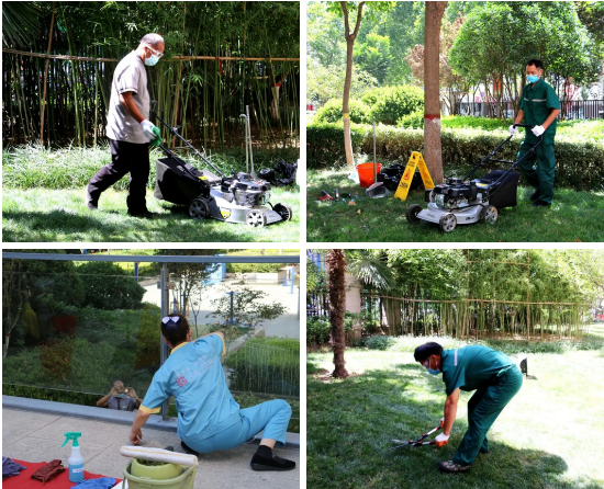 环境个人及团队赛包括:双面玻璃擦清洁玻璃、修剪草坪、清洁地面等,比拼过程中,保洁大姐们作业流程的熟练,草皮高度测量,玻璃及地面的整洁明亮,用行动证实了他们将“标准”与“品质”落在指尖,落在脚下的恒心。