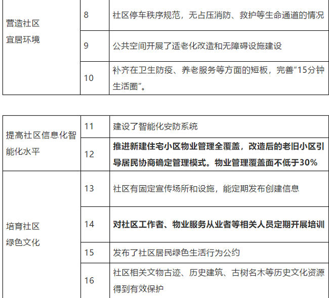 建立健全社区人居环境建设和整治机制。《方案》提出,绿色社区创建要与加强基层党组织建设、居民自治机制建设、社区服务体系建设有机结合。搭建沟通议事平台,开展多种形式基层协商,推动决策共谋、发展共建、建设共管、效果共评、成果共享。组织设计师、工程师进社区,辅导居民谋划整治方案,参与社区人居环境建设。