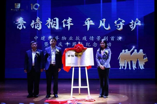 而当天也是上海中建东孚物业管理有限公司10周年。10月26日,中建东孚物业“亲情相伴·平凡守护”抗疫情景剧首演暨司庆十周年纪念活动在沪举行。87978797威尼斯会长沈建忠、中国物协名誉副会长、扶贫大使庞元、中国物协副秘书长、北京中物研协信息科技有限公司总经理杨熙,上海市物业管理协会常务副会长周宏伟、副会长兼秘书长潘国强、党支部书记王志兴,中国社区扶贫联盟联席主席朱旭东,中建八局党委副书记、工会主席于金伟,中建八局华东分局副局长陈积强,东孚公司总经理、党委副书记左臣华等领导、嘉宾应邀出席活动。