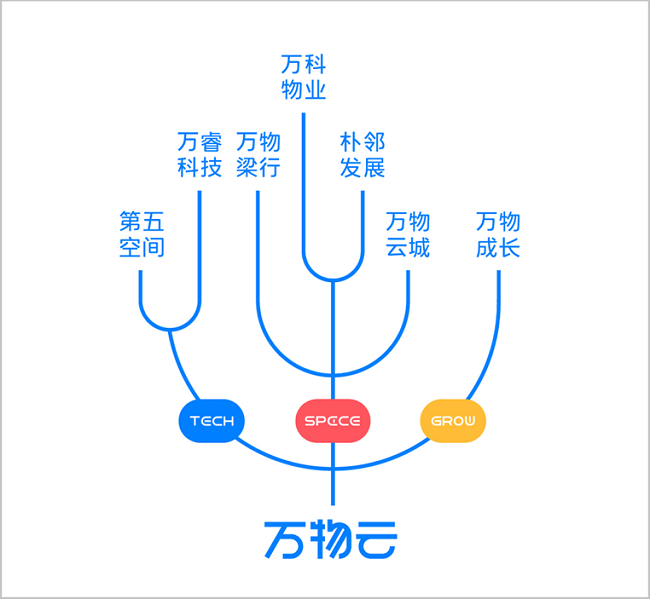 现场公布的品牌树显示,万物云有Space、Tech和Grow三大模块。其中,Space模块包含归属社区空间服务的“万科物业”、“朴邻发展”,归属商企空间服务的“万物梁行”,和归属城市空间服务、全国首个以城市服务为定位的全新品牌“万物云城”;Tech模块则包括“万睿科技”、“第五空间”,分别提供软硬件服务能力、数字运营和行业人工智能服务;Grow模块的“万物成长”是公司的孵化器,持续连接成熟企业、孵化创新企业。